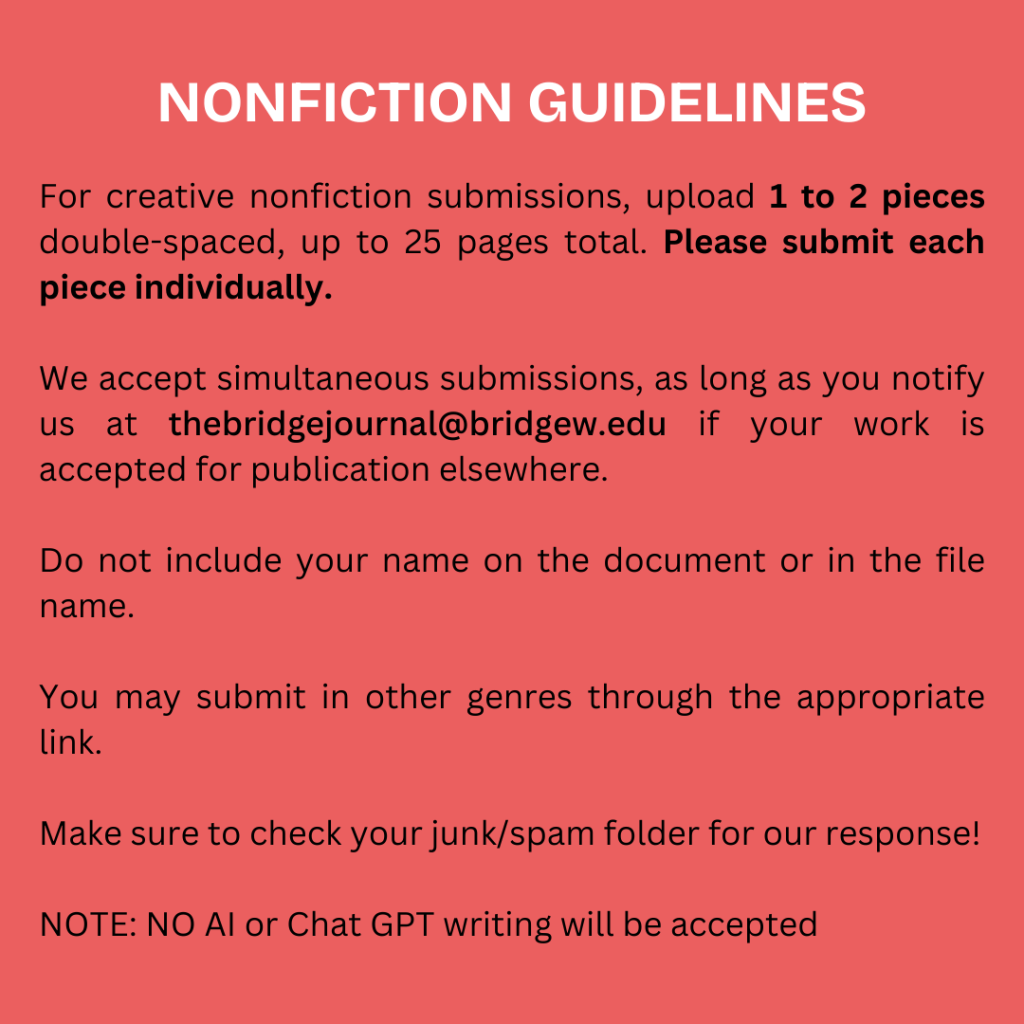 The staff of Volume 23 will review submissions from September 19th until December 12th. We will try to respond within three months. We accept simultaneous submissions, as long as you notify us if your work is accepted for publication elsewhere: thebridgejournal@bridgew.edu