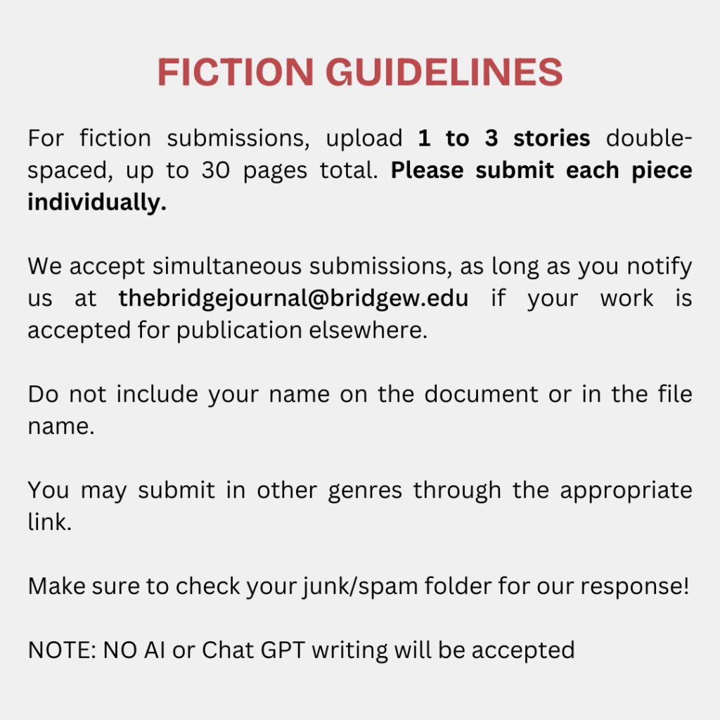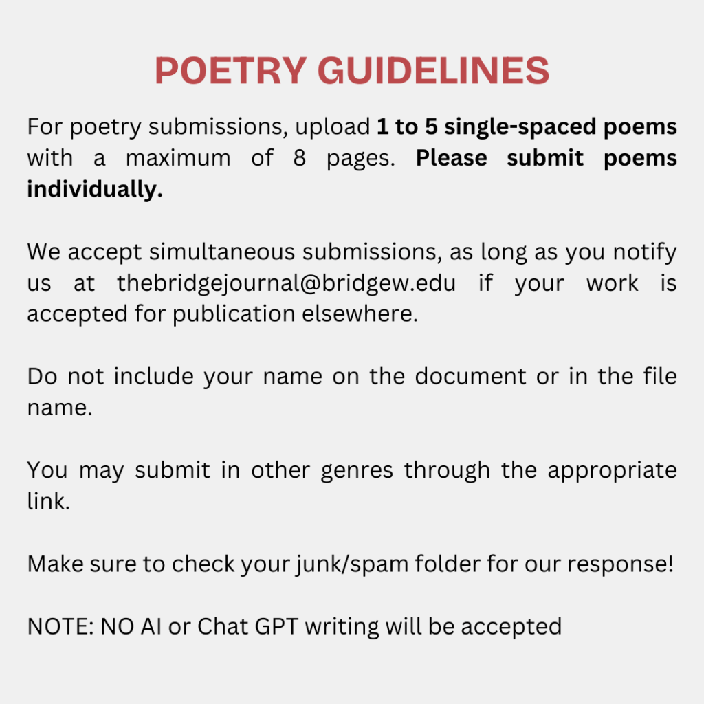 All work published in The Bridge is eligible for our annual Bridge Awards, which honor exceptional work with a monetary prize of $150, $100, or $75.